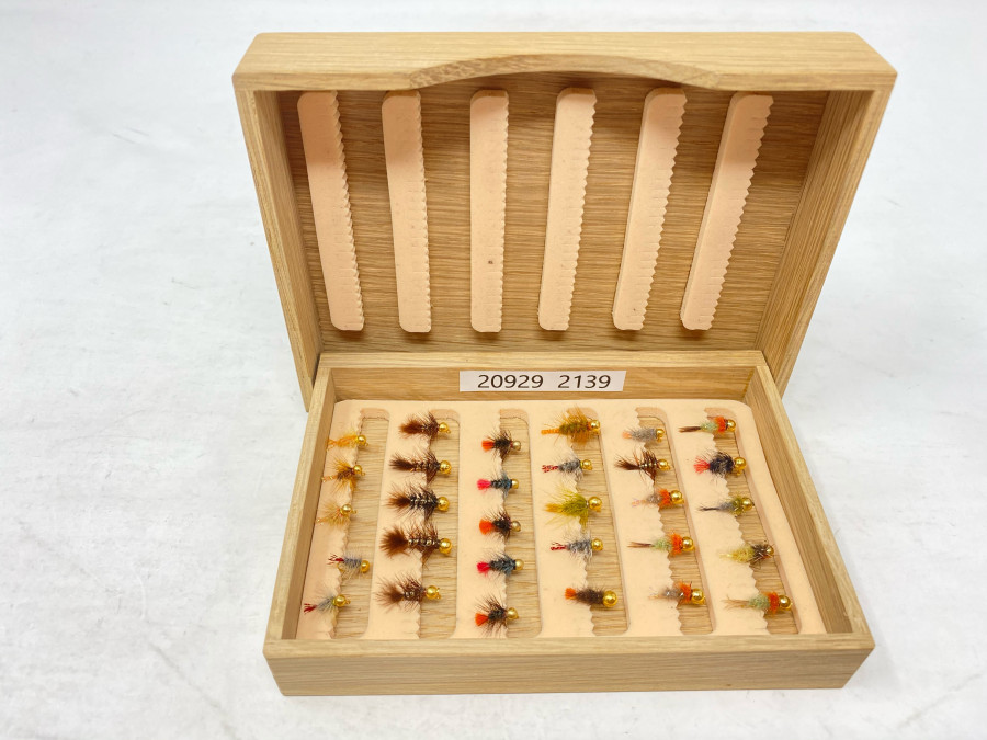 Holzfliegenbox mit 30 Goldkopf Minijig´s